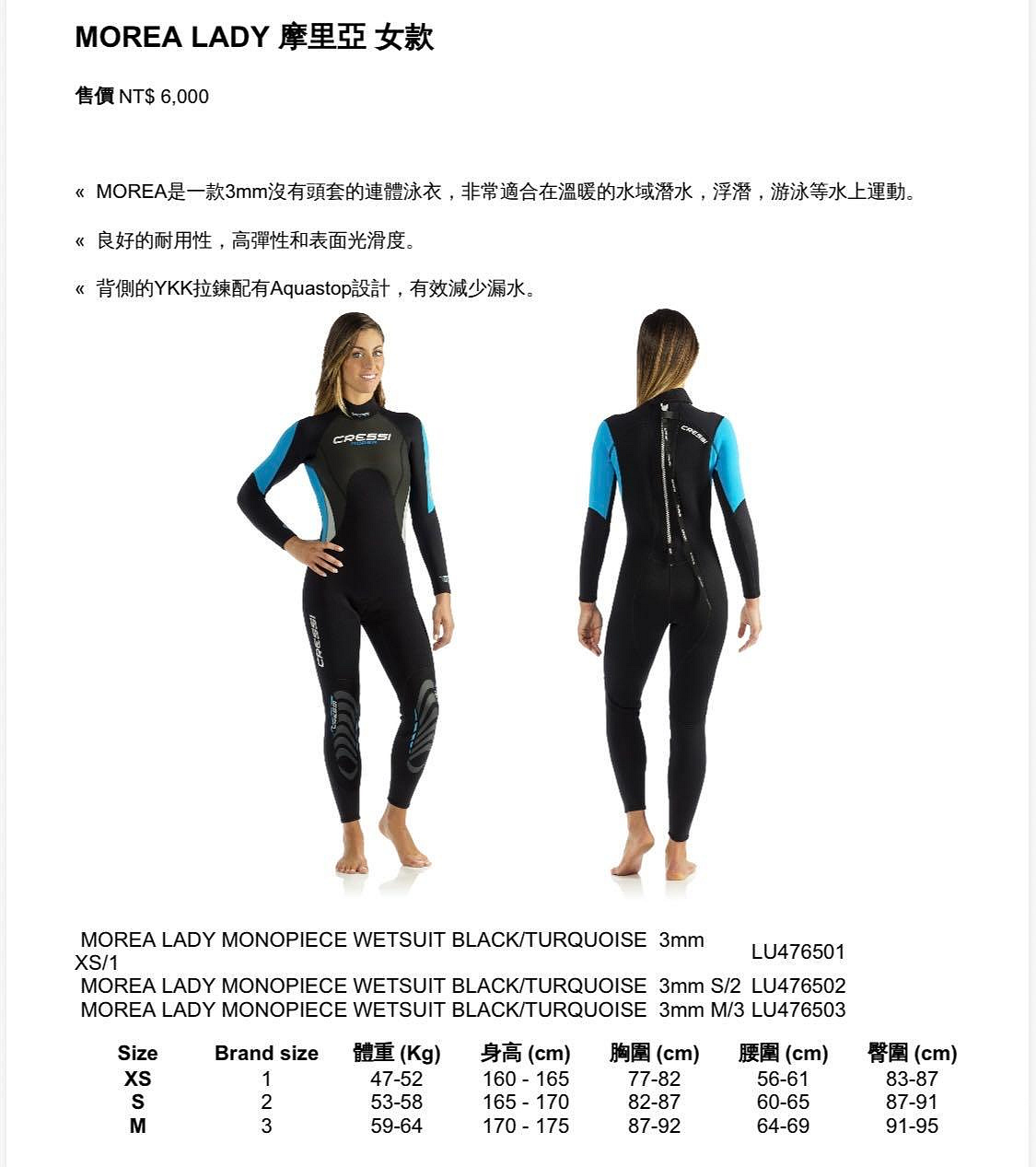 台灣潛水-CRESSI MOREA LADY 3mm 女款連身防寒衣