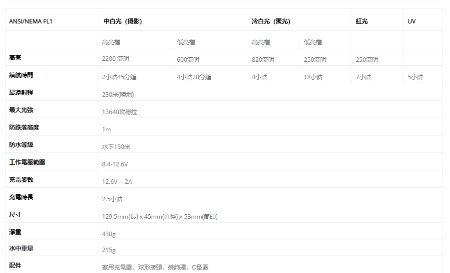 • 尺寸:129.5 x 45 mm / 燈頭 53 mm,重量:430 g (水中重量215 g)